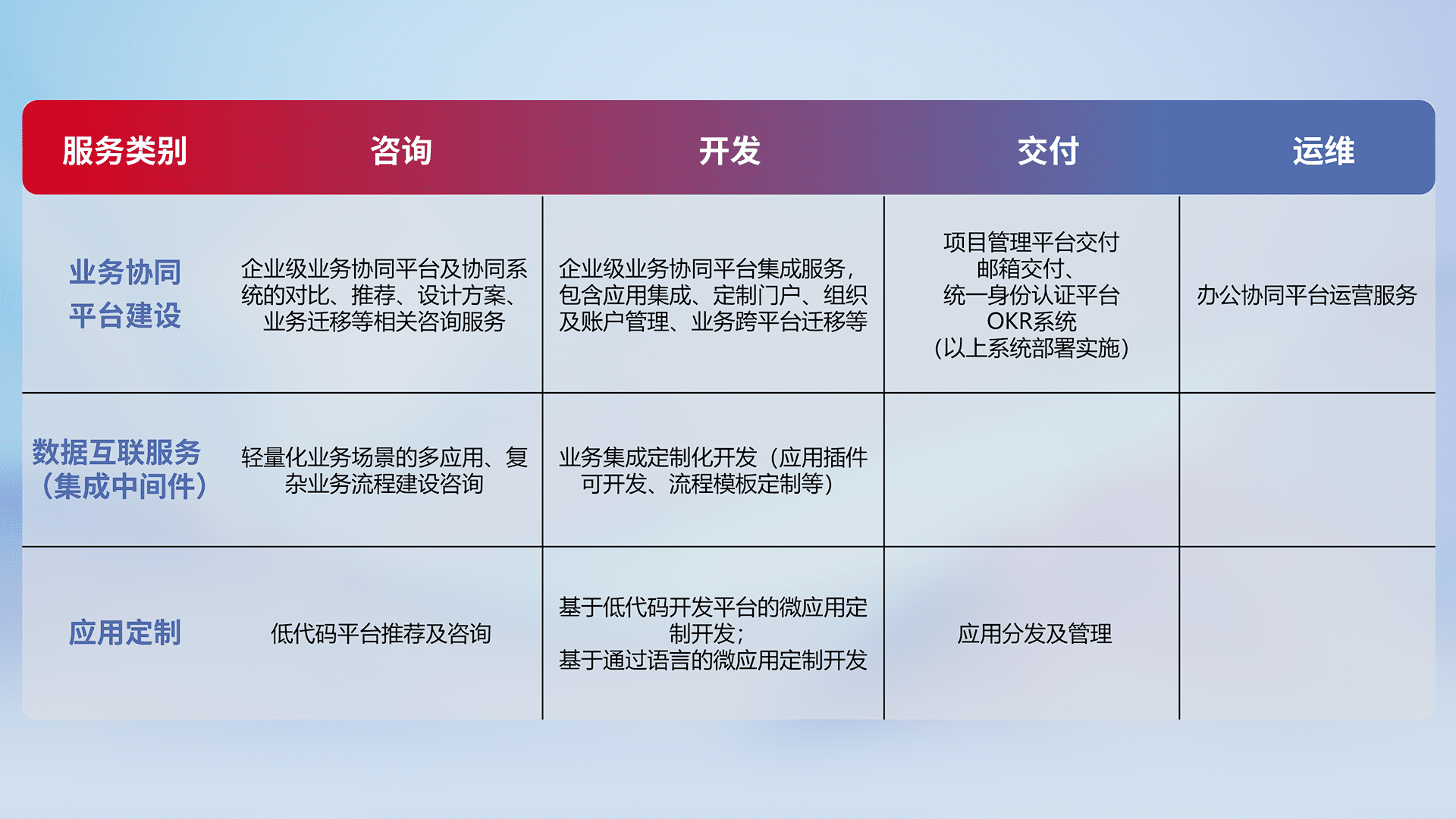 针对钉钉、、、、企微、、、IDaas等平台级产品提供产品的规划、、、、方案、、、、交付、、定制化开发等服务,,,实现如统一协同办公、、、智能客户服务、、、混合会议管理、、、、智能数据查询、、、等业务场景,,,实现数字化转型。。。。